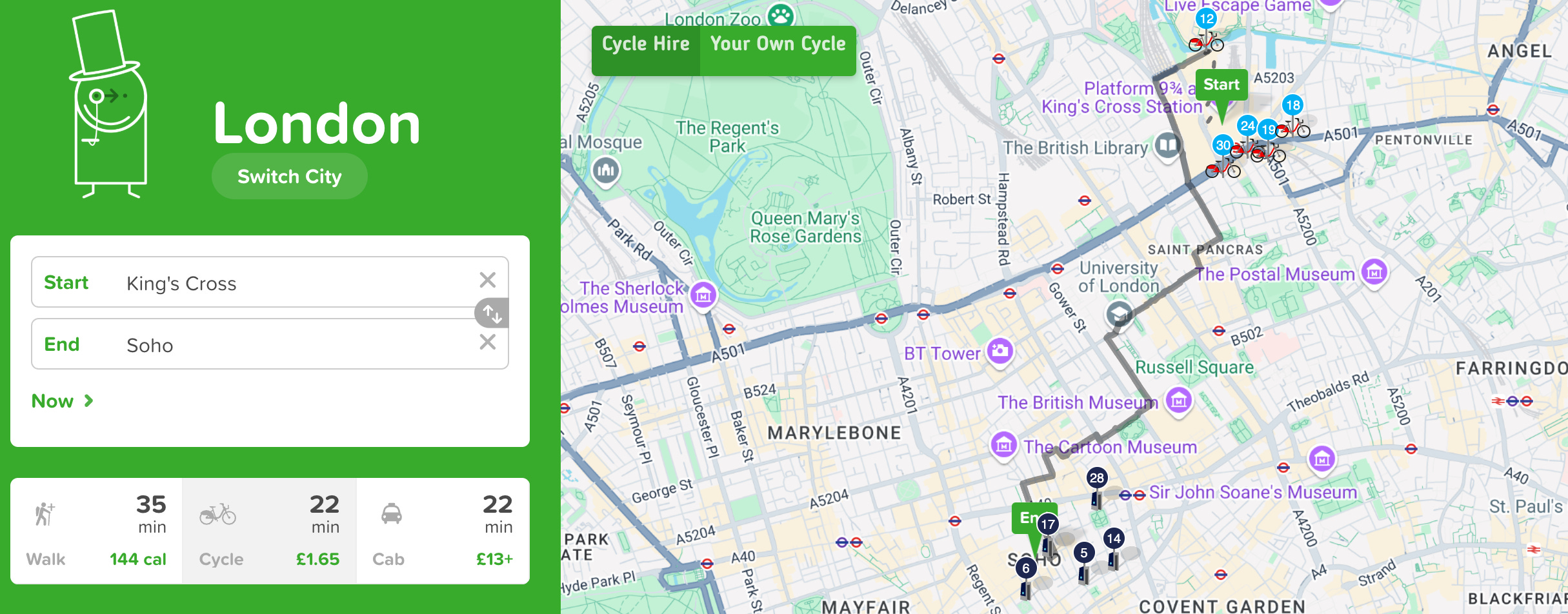 35 minutes. The exact time it takes to walk from Kings Cross Station to Soho.