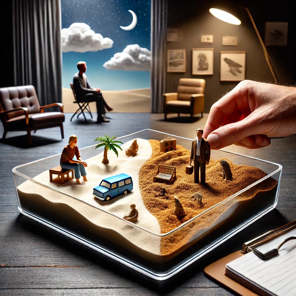 Literally a tray of sand and a large array of figures for them to choose from. I often say it is like painting a picture for people who have no artistic talent. You create a 3d picture in the sand using whatever you want. Telling a story