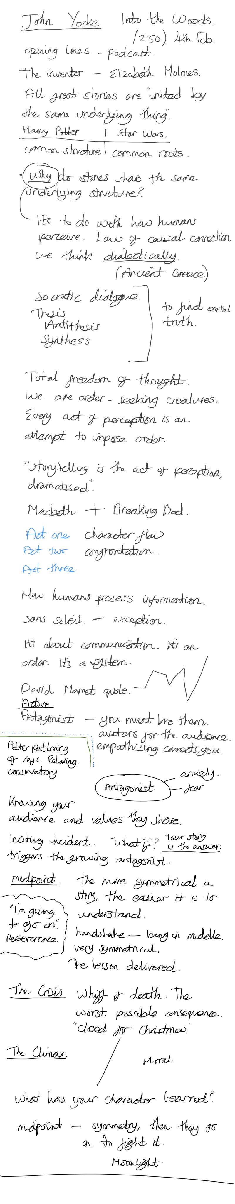 I was recently in a class with a well known author on story called John Yorke. (He has a book called Into the Woods, which I think is what raised his profile - to be fact checked with more time). He crystalised story in a couple of ways that I really enjoyed; story is thesis, antithesis and synthesis. The other was that ultimately story is about being able to communicate. Story is how humans process and share information.